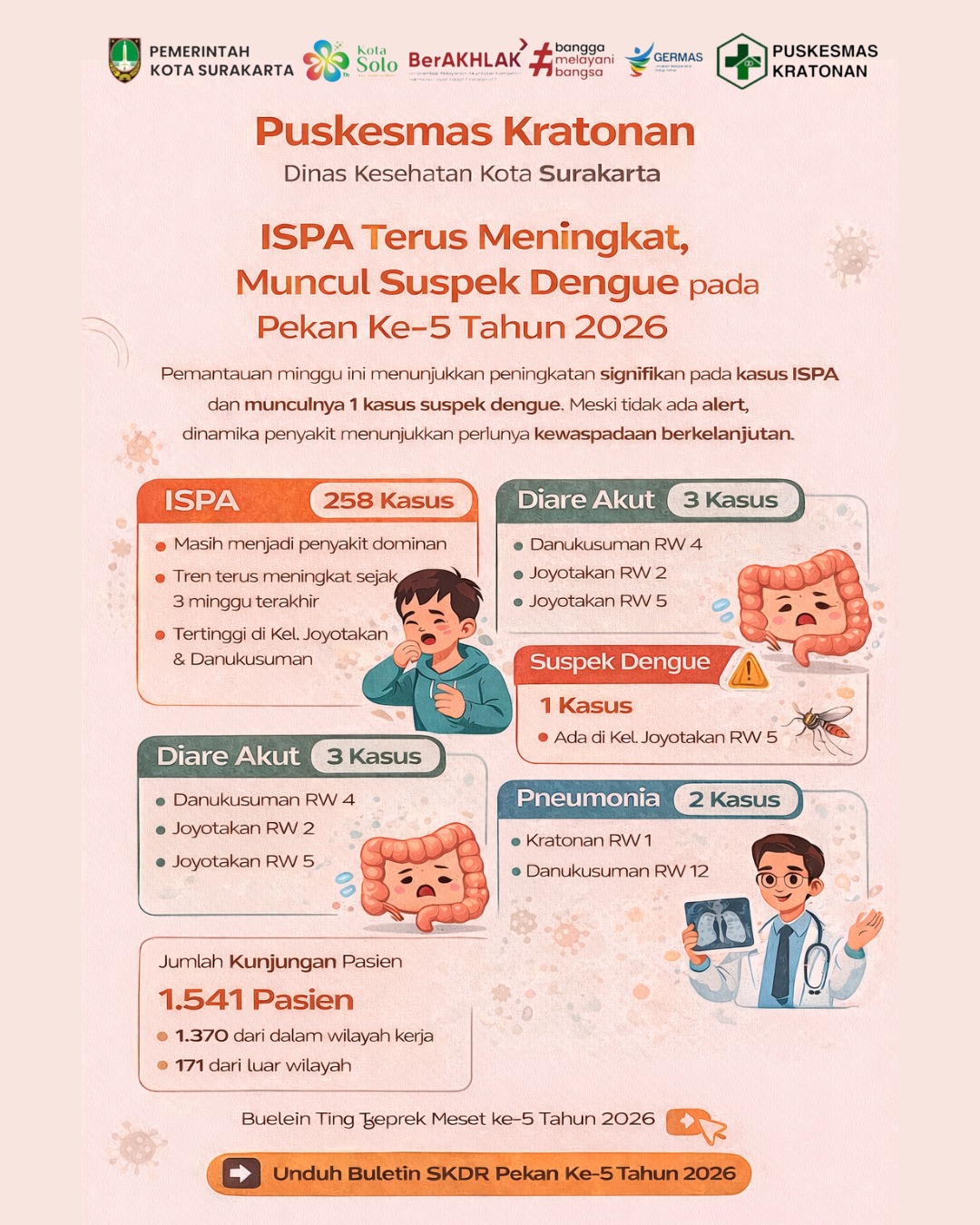 Pada Pekan Epidemiologi ke-6 (09–14 Februari 2026), Puskesmas Kratonan mencatat 1.673 kunjungan pasien, dengan 1.475 kunjungan berasal dari wilayah kerja dan 231 kunjungan dari luar wilayah. Jumlah kunjungan ini meningkat dibanding minggu sebelumnya, namun tidak disertai munculnya alert SKDR, sehingga situasi secara umum masih dalam kondisi terkendali.